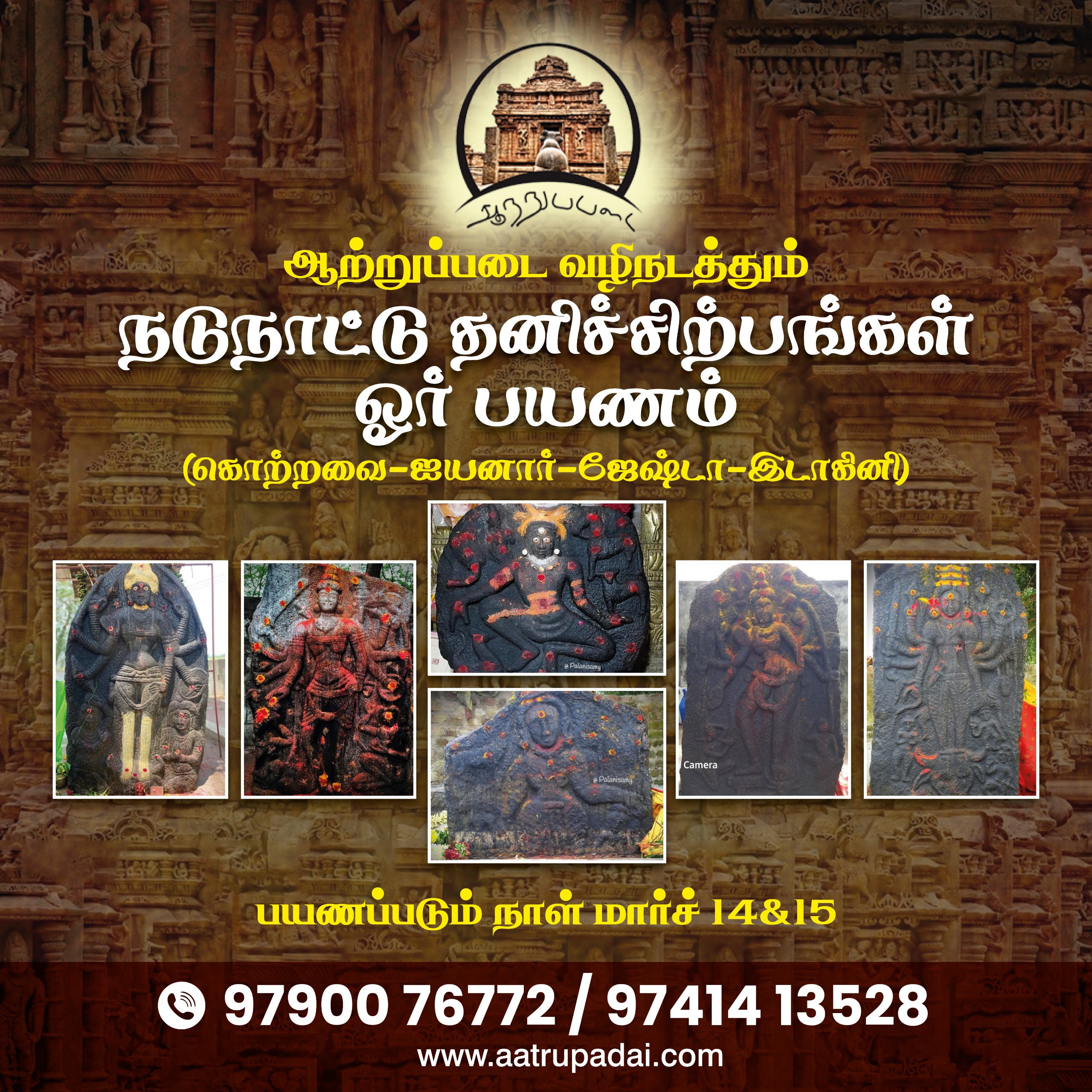 ஆற்றுப்படை வழிநடத்தலில், கொற்றவை, ஜயனர், ஜேஷ்டா மற்றும் இடாகினி ஆகிய தொன்மையான சிற்பங்களின் வரலாறு, தத்துவம் மற்றும் ஆன்மீகத் தன்மைகளை அறிந்துகொள்ளும் சிறப்பு பயணம்.